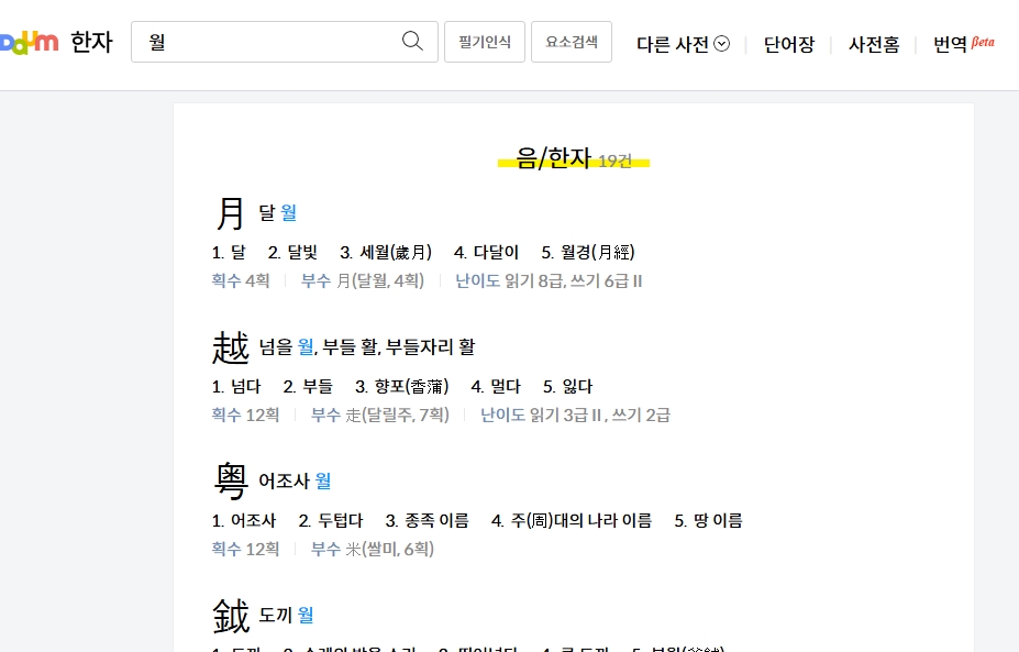 3. 월을 검색하면 달월(月), 넘을월(越), 어조사월(曰) 등의 한자가 검색됩니다. 이 또한 각각의 뜻과 관련된 예문을 확인할 수 있습니다.