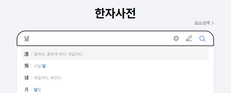 2. 검색창에 달을 입력하면 달월(月), 통할달(達), 달현(現) 등의 결과가 나타납니다. 각 한자의 뜻과 쓰임새가 자세히 나와 있어 필요한 한자를 쉽게 찾을 수 있습니다.