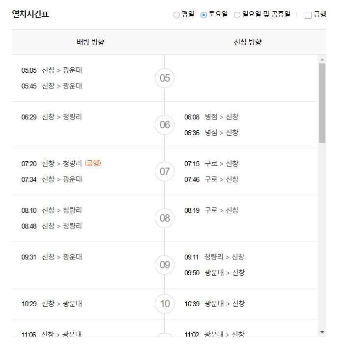 3. 토요일 시간표를 보면 신창 방향과 청량리 방향의 열차 운행 시간이 나와 있어요. 우선 오전 7시 20분에 신창에서 출발해 청량리로 가는 급행 열차가 있습니다. 이 열차는 토요일 아침 일찍 출발해서 수도권으로 가려는 사람들에게 아주 유용하죠. 이후 청량리에서 신창으로 돌아오는 열차는 오전 11시 37분에 첫 출발을 해요. 이 시간표는 토요일에만 적용되니 주말에 이동하실 계획이 있다면 꼭 확인해보셔야 해요.