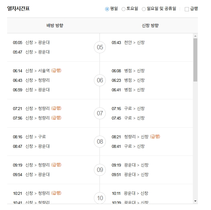 4. 평일 시간표는 확실히 더 많은 열차가 운행되고 있어요. 새벽 5시 5분에 신창에서 광운대로 가는 열차가 첫차로 출발합니다. 이후에도 6시 14분에는 신창에서 서울역으로 가는 급행 열차가 있어요. 이 급행 열차는 주요 역만 정차하기 때문에 이동 시간이 훨씬 단축되죠. 신창 방향으로는 새벽 5시 43분에 천안에서 출발해서 신창으로 가는 열차가 있어요. 그 외에도 병점에서 출발하는 열차가 6시대에 여러 번 운행되고 있습니다. 평일에는 출퇴근 시간대와 주요 시간대에 배차 간격이 짧아서 이용하기 편리해요.