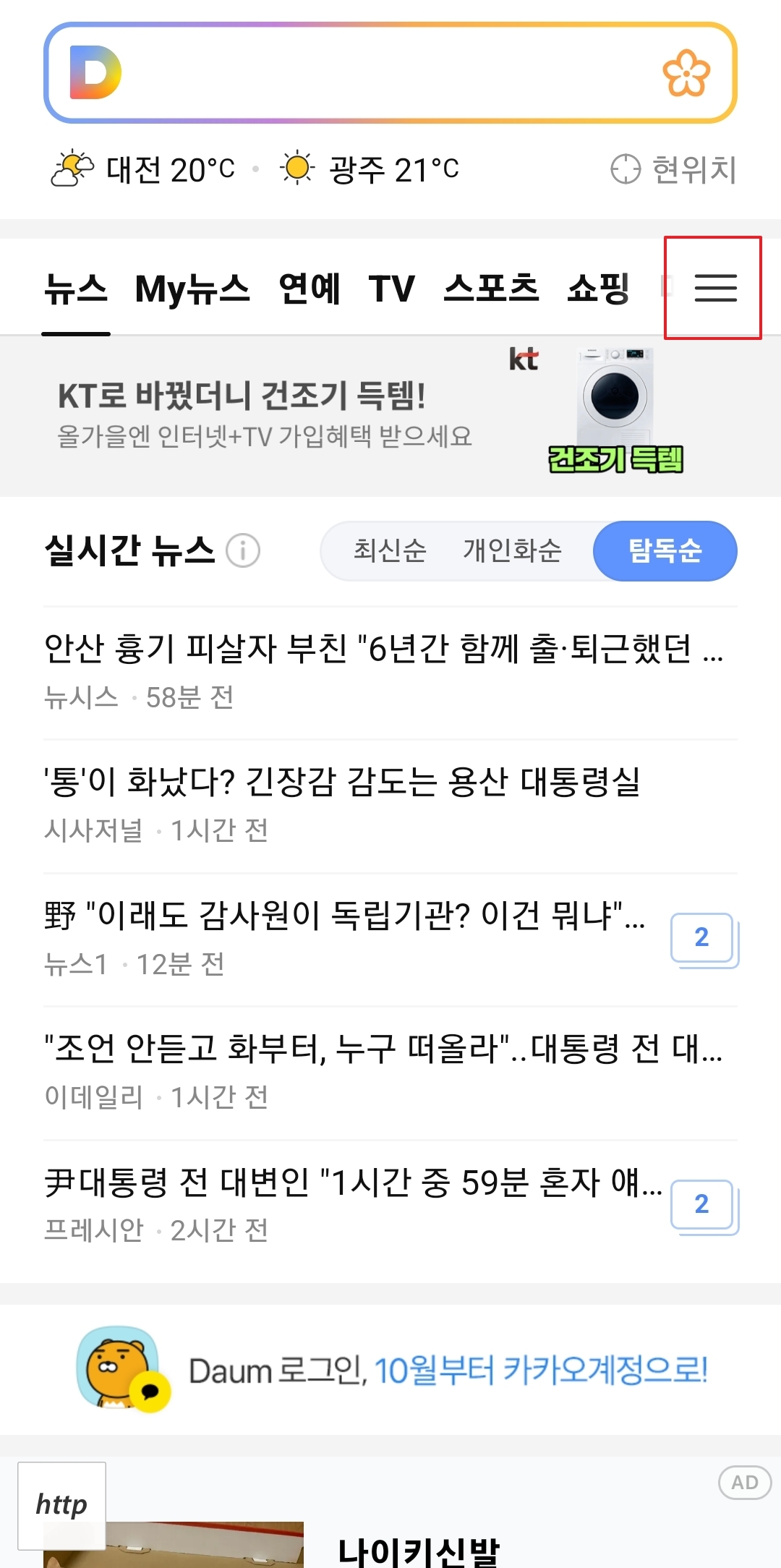 두번째는 다음 어플을 사용하는게 아니라 모바일 브라우저(예: 삼성 인터넷, 크롬)를 사용하여 다음 웹사이트를 엽니다. 브라우저의 설정 메뉴로 이동하고 다크모드 옵션을 찾습니다. - 해당 브라우저의 다크모드를 활성화하면 다음 웹사이트가 다크모드로 표시됩니다.