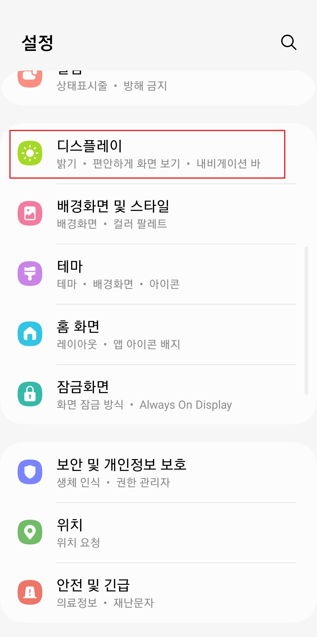 1. 먼저 휴대폰 설정 앱을 실행합니다. 설정 화면이 열리면 화면을 아래로 스크롤하여 디스플레이 또는 화면 메뉴를 찾고 클릭합니다. 디스플레이 메뉴는 일반적으로 화면 관련 설정을 관리하는 섹션에 위치해 있습니다.