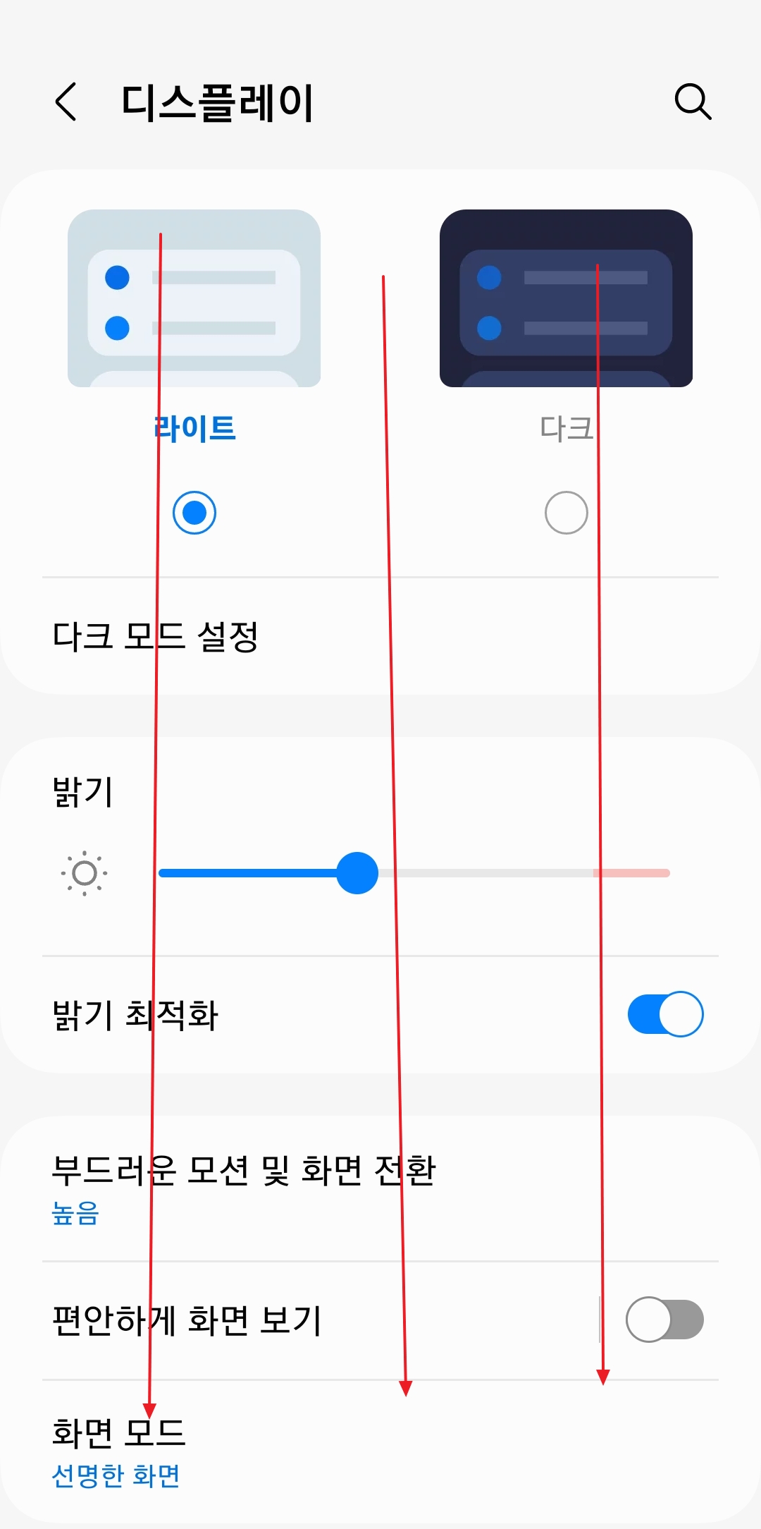 2. 디스플레이 메뉴로 이동하면 다양한 화면 관련 옵션이 표시됩니다. 여기서 화면을 다시 아래로 스크롤하여 터치 민감도라는 메뉴를 찾아 클릭합니다. 터치 민감도 메뉴는 모든 기기에 동일하게 표시되지 않을 수 있으니, 메뉴 위치는 기기 제조사나 운영체제 버전에 따라 약간 다를 수 있습니다.
