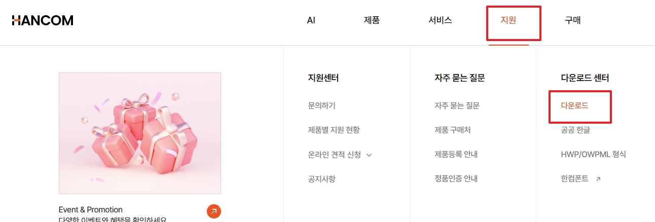 2. 상단 메뉴에서 지원 항목을 클릭한 후, 하위 메뉴에서 다운로드센터를 선택합니다. 다운로드센터로 이동하면 다양한 제품의 설치 파일과 관련 정보를 확인할 수 있습니다. 여기에서 다운로드 버튼을 클릭하여 본격적으로 파일을 받는 단계로 이동합니다.