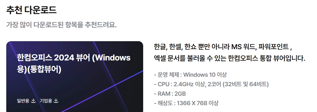 3. 다운로드센터에서 한컴오피스 통합 뷰어 항목을 찾습니다. 한컴오피스 통합 뷰어는 한글, 한셀, 한쇼뿐만 아니라 MS 워드, 파워포인트, 엑셀 문서까지 열람할 수 있는 소프트웨어입니다. Windows 10 이상에서 실행 가능하며, 최소 사양으로는 2.4GHz 이상의 CPU, 2GB RAM, 해상도 1366 x 768 이상의 사양이 요구됩니다.