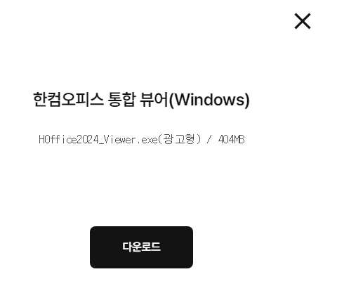 4. 한컴오피스 통합 뷰어 항목에서 다운로드 버튼을 클릭하면 설치 파일(HOffice2024_Viewer.exe, 약 404MB)을 받을 수 있습니다. 다운로드가 완료되면 설치 파일을 실행해 프로그램을 설치합니다. 설치가 완료되면 문서 열람 기능을 바로 사용할 수 있습니다.