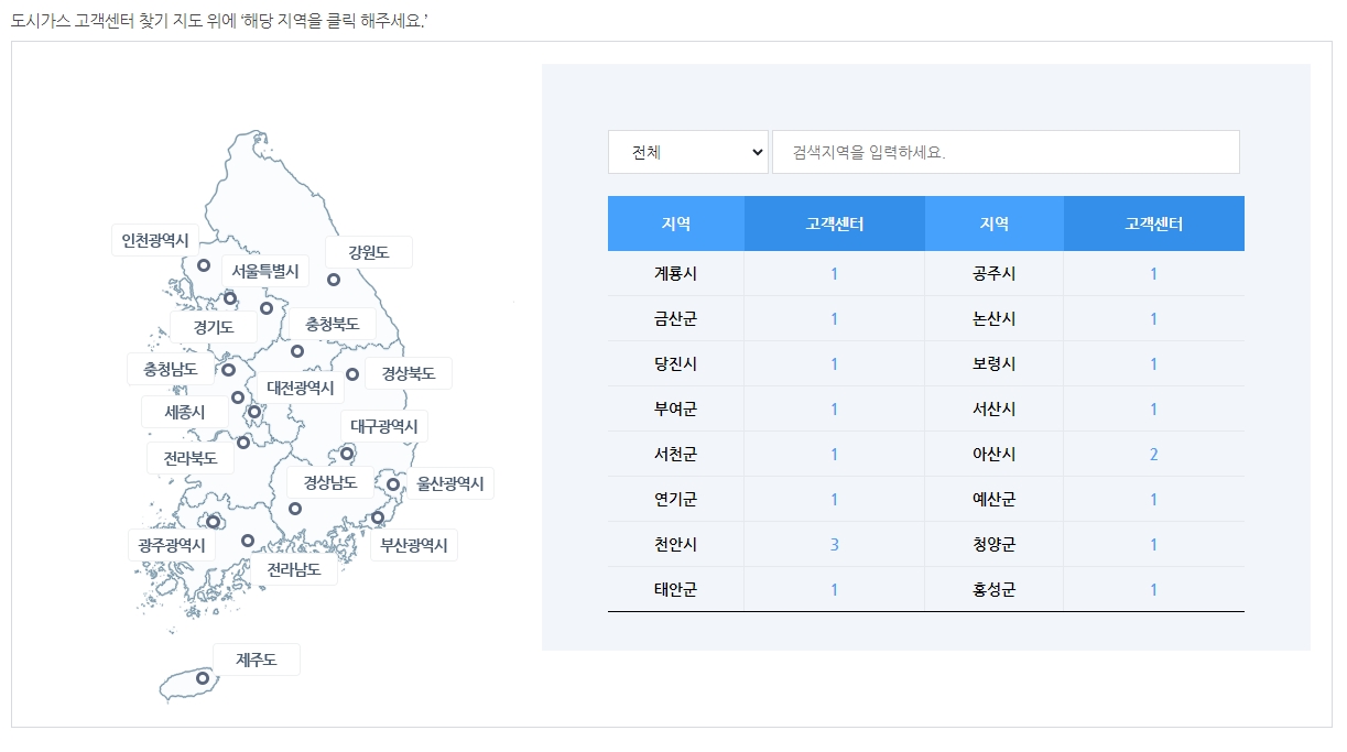 \ 선택한 지역에 따라, 해당 지역을 담당하는 도시가스 회사 정보가 나타납니다. 천안시의 경우 한 개의 회사가 가스를 제공하지만 고객센터는 다를 수 있습니다. 도시가스사명을 클릭하여 추가 정보를 얻을 수 있습니다.