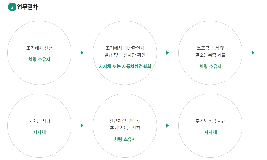 업무 절차는 신청, 확인, 보조금 지급의 순서로 진행됩니다. 이 과정을 통해 노후차량 조기폐차 보조금을 신청하고 지급받을 수 있습니다.