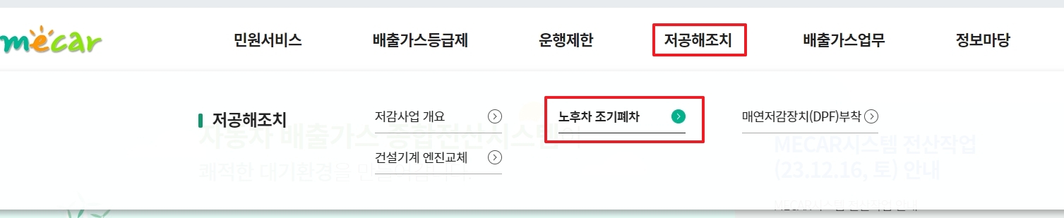 웹사이트 상단의 메뉴에서 저공해조치 섹션을 찾아 노후차조기폐차를 클릭합니다. 이곳에서 노후 경유차 폐차 지원금에 대한 자세한 안내를 확인할 수 있습니다.