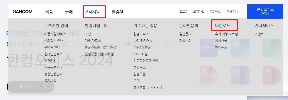 2. 상단 메뉴에서 고객지원 항목을 누르신 후, 이어서 다운로드 메뉴를 클릭해 주세요. 이곳은 한컴에서 공식으로 제공하는 프로그램과 각종 자료들을 받을 수 있는 곳이라 꼭 한번 들러보시는 걸 추천드립니다. 뷰어나 폰트, 드라이버 등 다양한 항목들이 이 페이지에 정리돼 있어요.