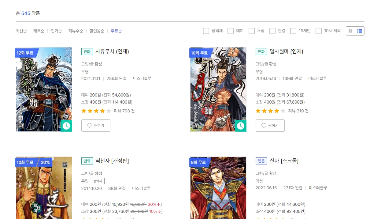 3. 무료 코너에 들어가면 보통 3권에서 5권 정도까지 무료로 제공되는 작품들이 있어요. 여기서 황성 작가의 이름이 붙은 작품들을 찾아보시고, 관심 가는 제목이 있다면 바로 클릭해서 감상 시작하시면 됩니다.