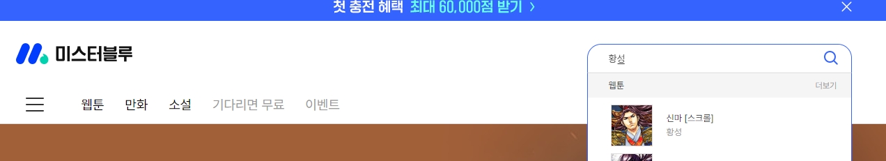 5. 이번에는 미스터블루 웹사이트로 이동해볼게요. 이곳도 무협 만화 좋아하시는 분들이 자주 찾는 플랫폼 중 하나로, 황성 작가의 다양한 작품들이 잘 정리되어 있어요.