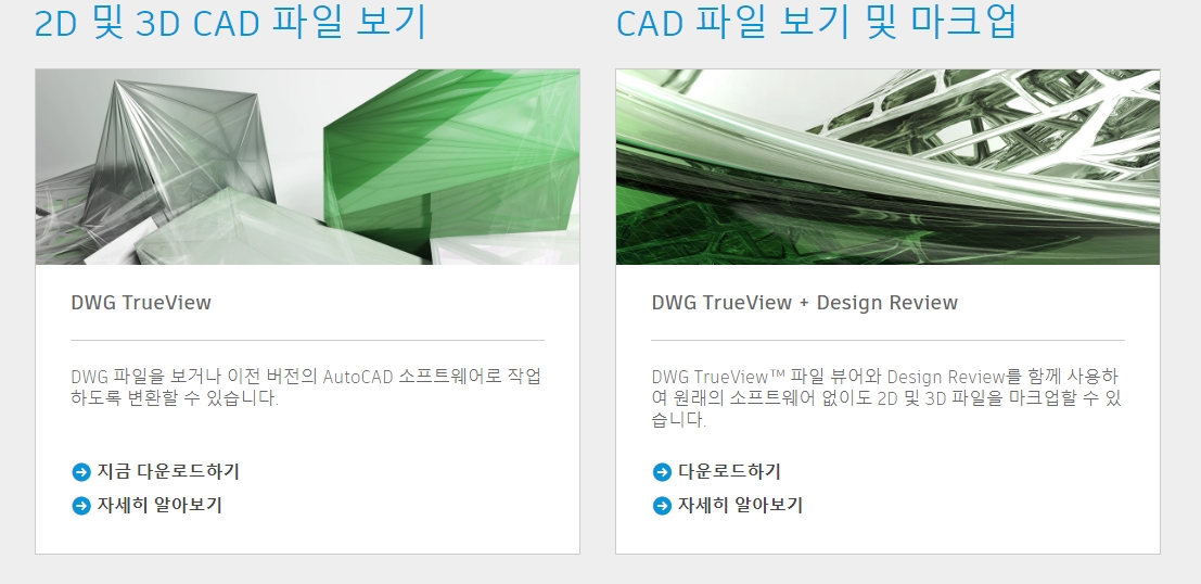 4. 여기서 DWG TrueView와 DWG TrueView + Design Review 중 하나를 선택하시면 됩니다. ‘다운로드 하기’ 버튼을 누르면 설치 파일을 받을 수 있는데요, 두 가지 모두 무료로 제공되며 설치도 어렵지 않습니다.