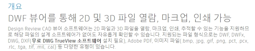 5. 이 뷰어를 설치하면 DWG뿐만 아니라 DWF, DXF, DWFx 등의 형식도 열 수 있어요. 단순히 도면만 보는 용도라면 충분히 강력한 기능이고, 2D뿐 아니라 3D 파일도 문제없이 확인할 수 있어요. 저도 개인적으로 잘 쓰고 있습니다.