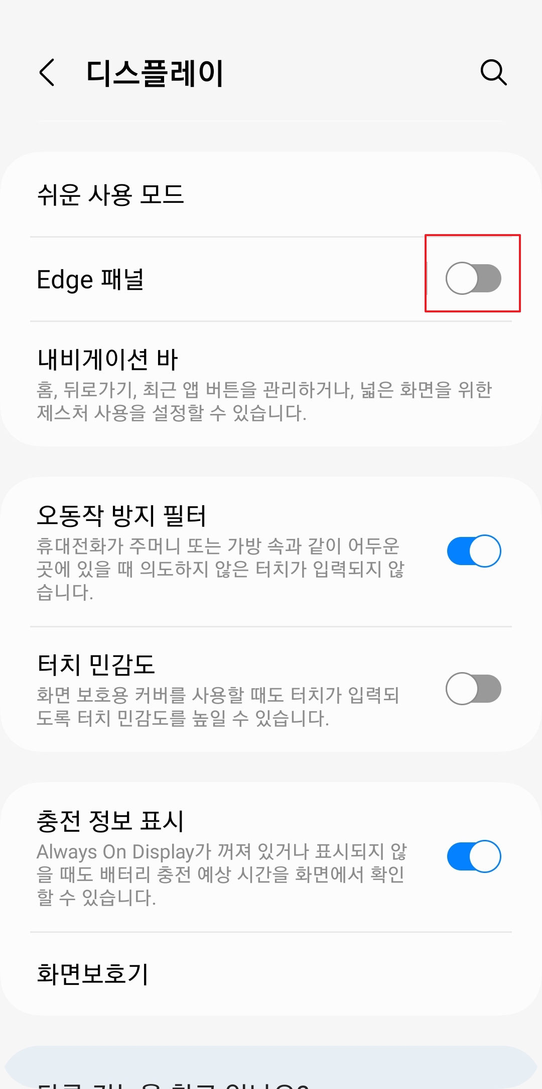 3. 디스플레이 메뉴로 들어가면 중간쯤에 Edge 패널이라는 항목이 있습니다. 이걸 찾으셨다면 옆에 있는 회색 버튼을 터치해서 기능을 활성화해 주세요. 아직 익숙하지 않더라도 이 기능이 나중에 얼마나 편한지 느끼게 되실 거예요.
