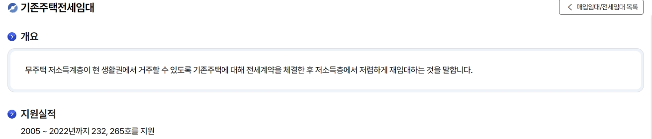 5. 그 다음 ‘기존주택’ 메뉴로 이동해 주세요. 이 부분은 기존에 있는 주택을 활용해서 저렴하게 거주할 수 있도록 도와주는 내용이에요. 무주택자분들에게 정말 유용한 정보가 가득하니 꼭 확인해보세요!