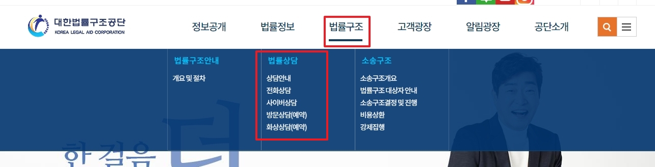 2. 상단 메뉴에서 ‘법률구조’ 항목을 클릭하고 이어서 ‘법률상담’을 찾아보세요. 이 메뉴는 다양한 상담 방법과 이용 방법이 잘 정리되어 있어 처음 방문하시는 분들도 어렵지 않게 이용할 수 있습니다. 제가 봤을 때는 구성도 직관적이라 금방 익숙해질 수 있을 것 같아요.