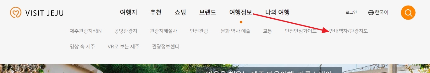 2. 홈페이지 상단 메뉴에서 여행정보를 클릭한 뒤 안내책자/관광지도 항목을 찾아 들어갑니다. 여기서는 제주도의 명소 정보와 함께 다양한 테마별 여행 자료들을 볼 수 있어요.