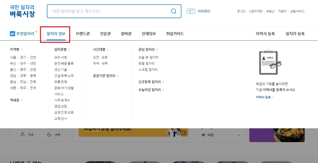2. 상단 메뉴 중 일자리정보를 선택하면 지역, 역세권, 업종, 근무시간 등 세분화된 조건으로 검색이 가능합니다. 서울 같은 대도시를 기준으로도 손쉽게 좁혀볼 수 있습니다.