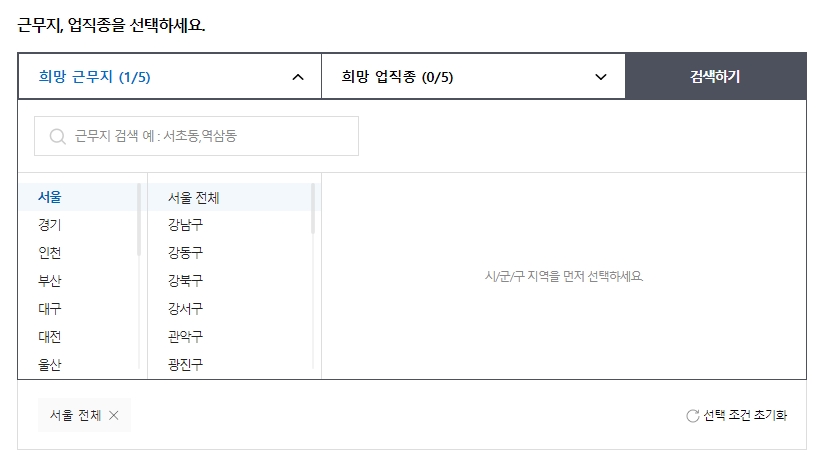 3. 서울을 클릭한 뒤에는 더 세부적으로 구 단위나 동 단위까지 선택할 수 있고, 필터를 조절해서 원하는 조건에 맞는 일자리만 골라볼 수 있어요.