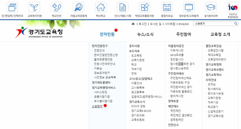 2. 예시로 경기도교육청 홈페이지에 접속했습니다. 지역마다 홈페이지가 다르니, 해당 지역 교육청 명칭으로 검색하시면 됩니다.