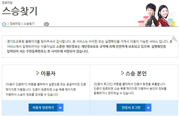 5. 예전 방식의 스승찾기 서비스 화면입니다. 이용자 인증 과정을 거쳐야 했습니다.