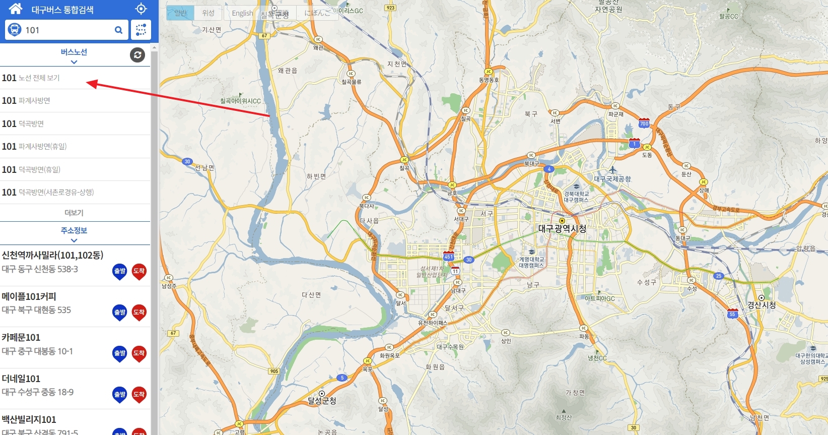 2. 메인 화면에 있는 검색창에 버스 번호나 정류소 이름을 입력하세요. 예를 들어, 101번이라고 입력하면 그 노선에 대한 정보가 쭉 나옵니다. 복잡한 설정 없이 빠르게 검색할 수 있어요.