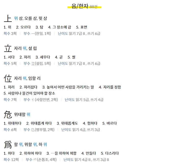 '위'라고 검색했을 경우에도 위치, 위태, 할위 등 다양한 단어가 포함된 한자가 검색되며, 한 글자의 한글 입력만으로도 관련 한자 전체를 손쉽게 확인할 수 있습니다. 이는 검색 알고리즘이 발음·의미 연계를 모두 인식하도록 설계되어 있기 때문입니다.