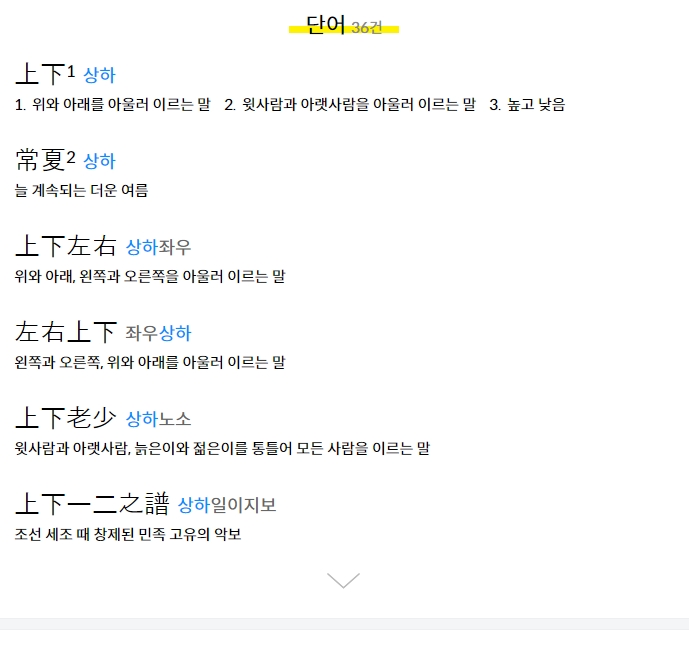 '상하'와 같은 복합어를 입력하면, 그 단어에 해당하는 정확한 한자 조합이 나타나고, 각 단어의 뜻과 예시도 함께 제공됩니다. 특히 상하좌우, 상하노소처럼 관용적 표현까지 검색되어 학습 효율을 더욱 높여줍니다.