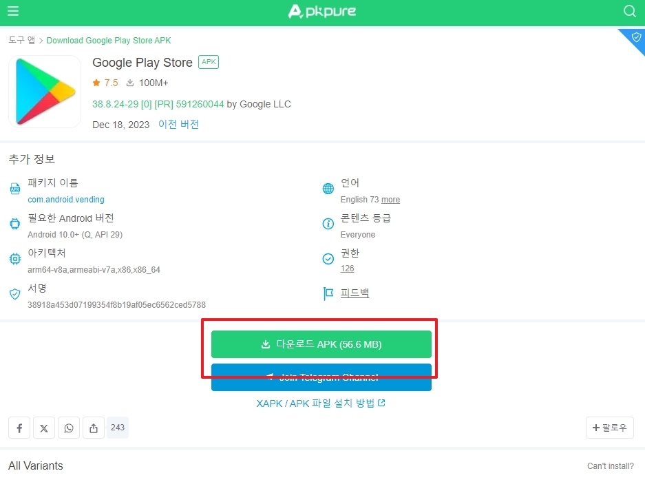 원하는 버전의 상세 페이지에서 다시 한번 다운로드 버튼을 클릭하면 APK 파일 다운로드가 시작됩니다. 다운로드 후 파일을 실행해 설치하면 완료됩니다.
