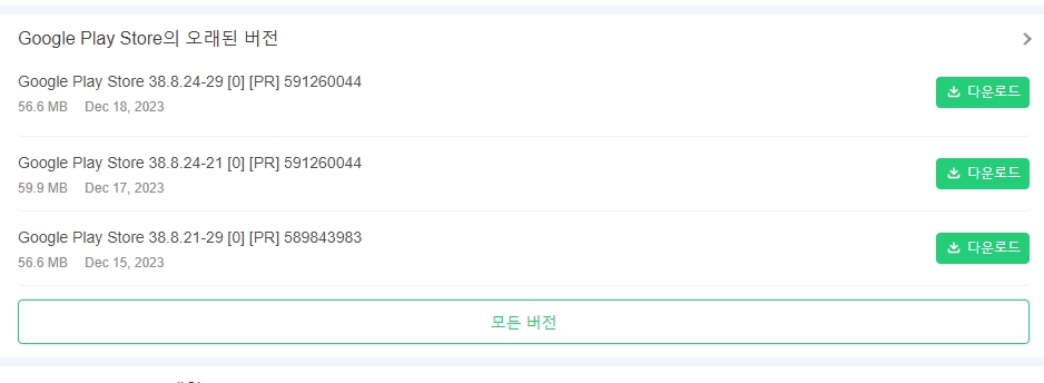 상세 페이지에서 스크롤을 내려 최신 버전과 함께 구버전도 확인할 수 있습니다. 기기 호환 문제가 있을 경우 구버전 설치가 필요할 수 있습니다.
