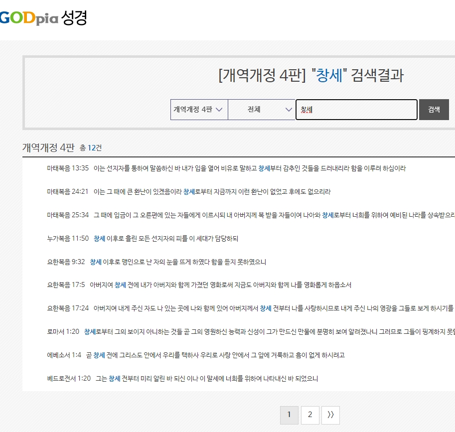 ‘창세’ 같은 단어로 검색하면 창세기에 대한 다양한 구절이 정리돼 나옵니다. 단어 하나로 시작해 원하는 내용까지 자연스럽게 이어지는 구조입니다.