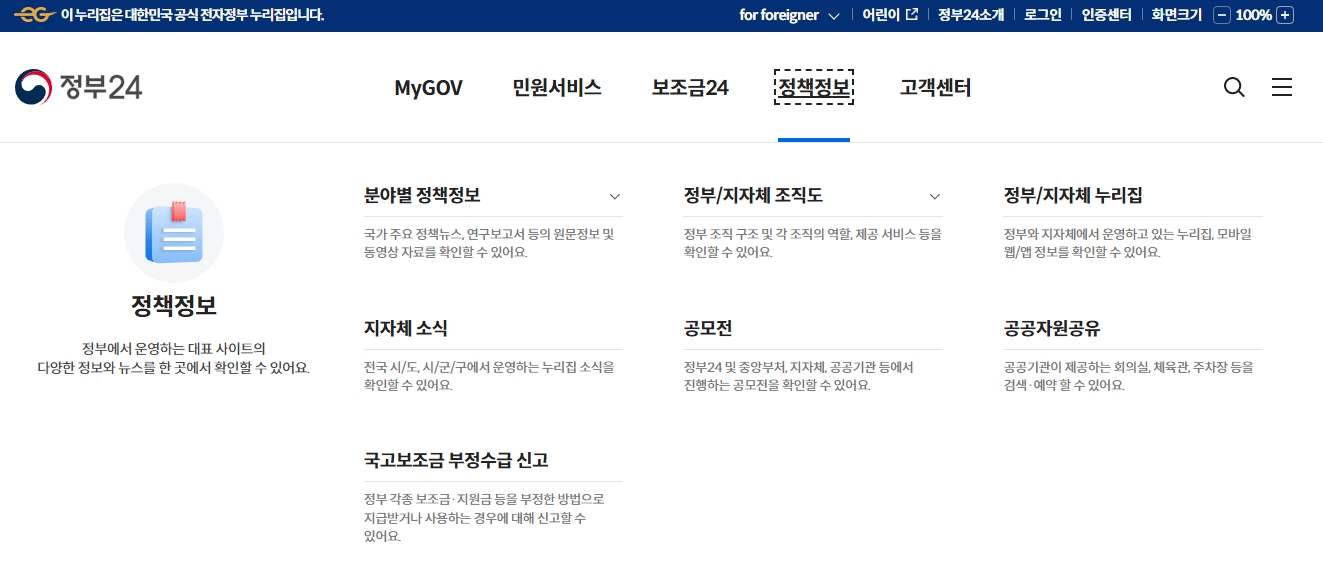 정책정보 메뉴에서는 분야별 정책 소식부터 국가 주요 뉴스, 보고서, 지자체 조직도까지 확인 가능합니다. 공공자원공유, 국고보조금 부정수급 신고도 같은 메뉴에서 함께 제공됩니다.