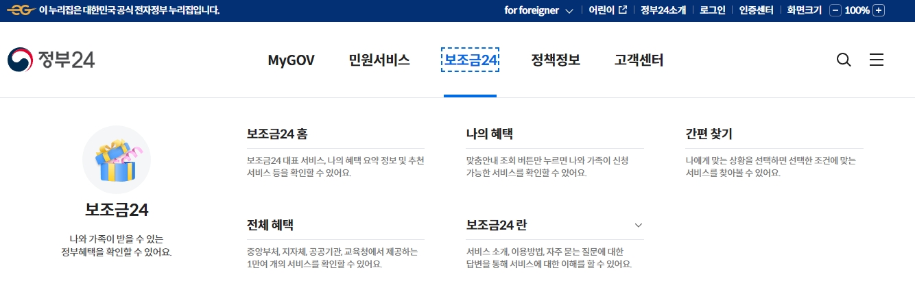 보조금24 메뉴에서는 보조금 관련 대표 서비스와 ‘나의 혜택 요약 정보’, 맞춤형 추천 서비스까지 제공합니다. 특히 신청 가능한 서비스 조회 및 간편 찾기 기능은 시간 절약에 큰 도움이 됩니다.