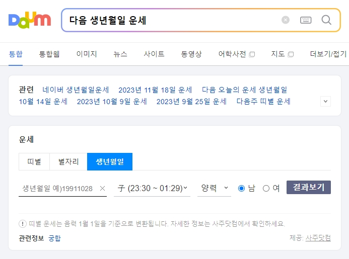 다음 검색창에 ‘생년월일 운세’라고 입력하면 바로 해당 페이지로 이동할 수 있습니다. 띠별, 별자리, 생년월일 운세 중 기본으로 생년월일 운세가 선택되어 있어 별다른 설정 없이 바로 이용 가능합니다.