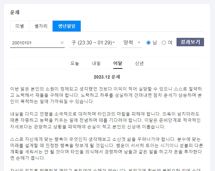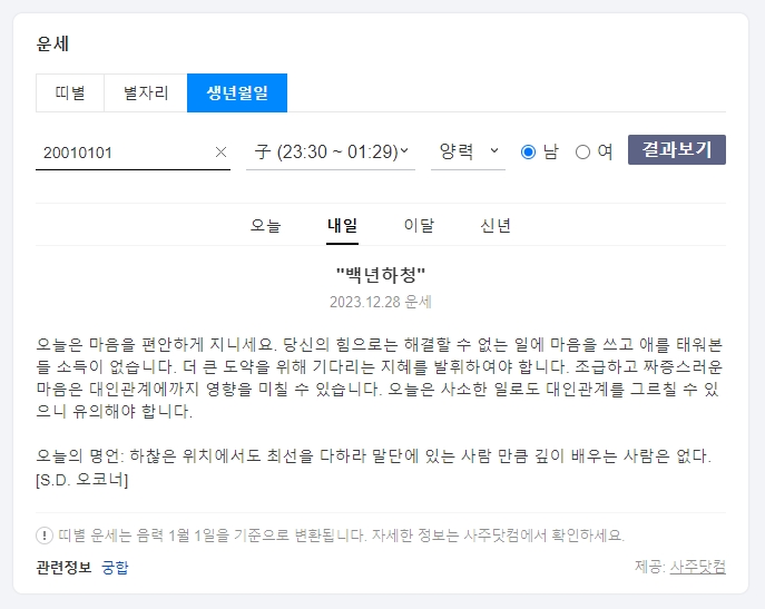 다음 무료 생년월일 운세는 생년월일과 태어난 시간, 성별만 입력하면 오늘부터 내년까지의 기본 운세를 간편하게 확인할 수 있는 서비스입니다. 띠별, 별자리 외에도 사주 기반의 정보까지 포함되어 있으며, 짧지만 핵심적인 조언들을 빠르게 얻고 싶은 분들에게 적합합니다.