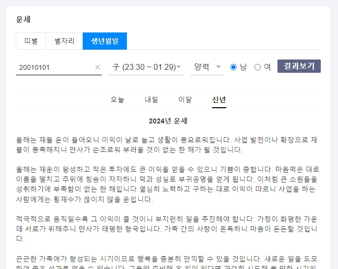 연말이 다가오면 자동으로 신년 운세가 제공됩니다. 재물운, 연애운, 진로 등 다양한 항목이 포괄적으로 다뤄지며, 해당 해의 전반적인 흐름을 미리 살펴볼 수 있습니다.