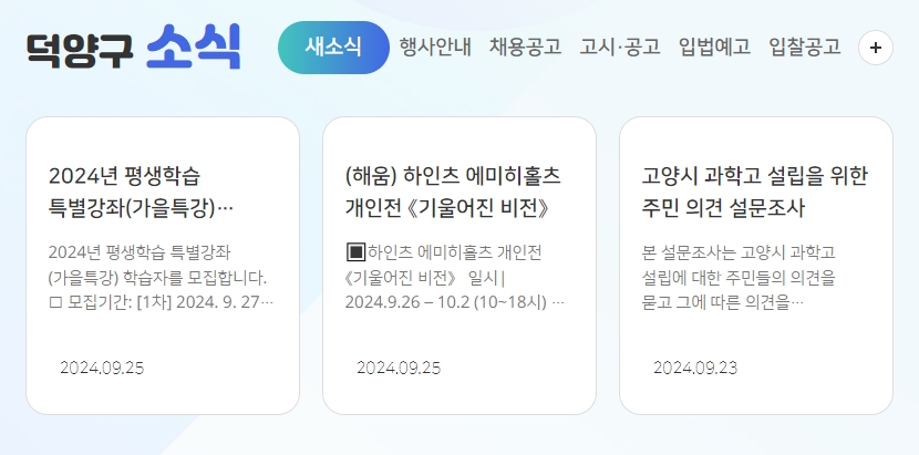 행사 소식, 채용 공고 등 최신 정보를 빠르게 확인할 수 있는 공간입니다. 특히 덕양구 내에서 진행되는 주요 행사 일정을 사전에 파악할 수 있어 참여를 계획하기 좋습니다.