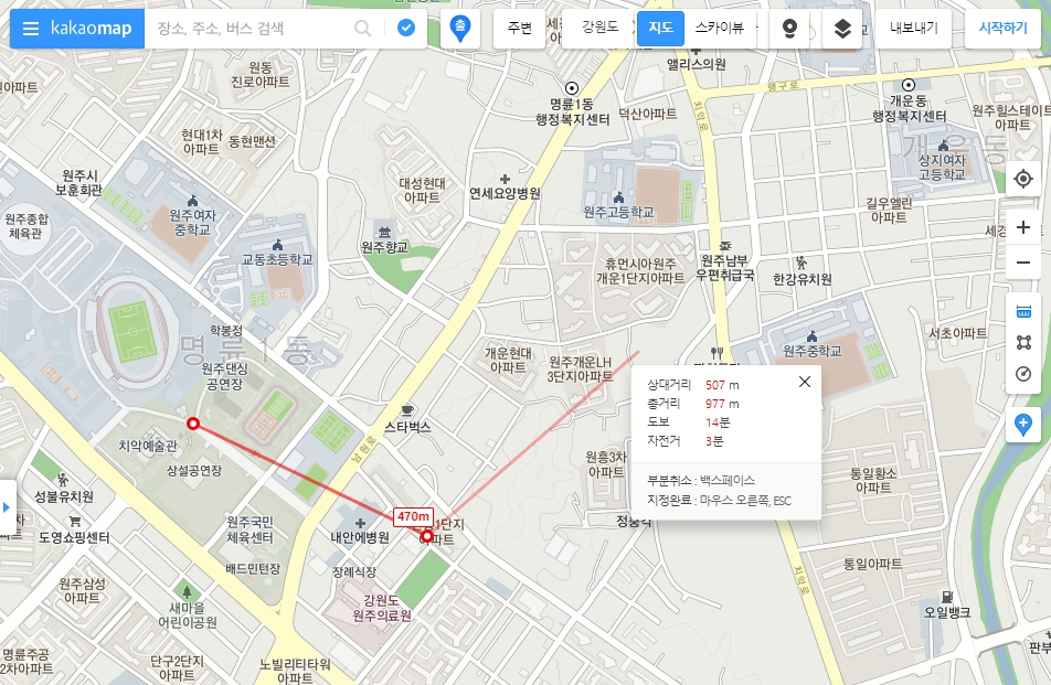 측정된 총 거리는 화면 상단에 표시되며, 도보·자전거 이동 시간도 함께 확인 가능합니다. 단, 실제 이동 환경에 따라 소요 시간은 달라질 수 있습니다.
