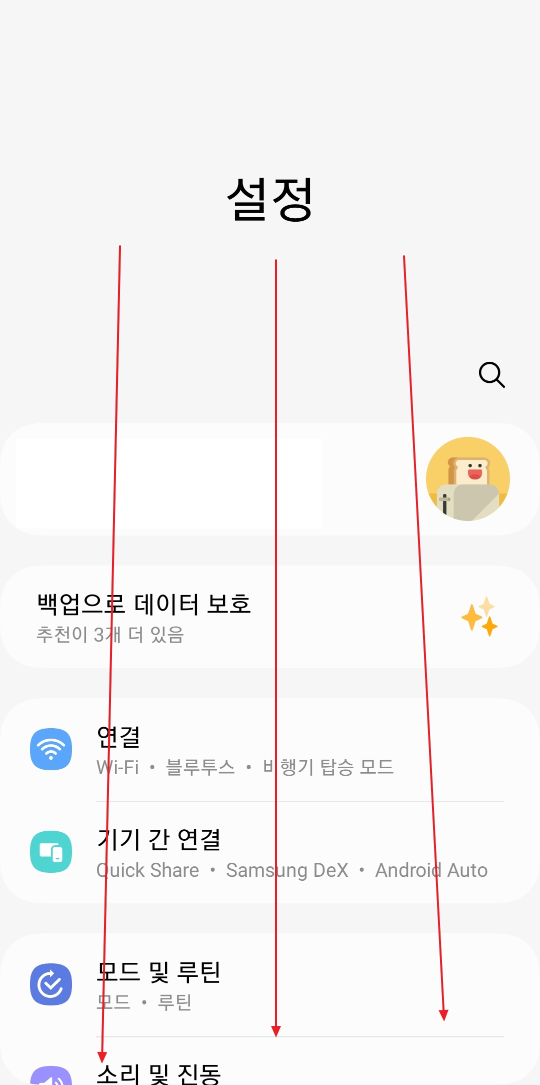 4. 설정창에서 화면을 아래로 스크롤하여 일반 메뉴를 클릭합니다.