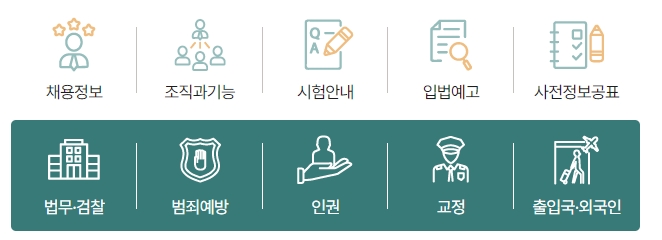 4. 법무정책 서비스 메뉴에서는 범죄 예방, 인권 보호 등 법무부의 주요 국정 과제와 시행 중인 정책 정보를 확인할 수 있습니다. 예컨대 교정 시설 운영 방식이나 외국인 출입국 관련 절차 안내를 찾아볼 수 있습니다.