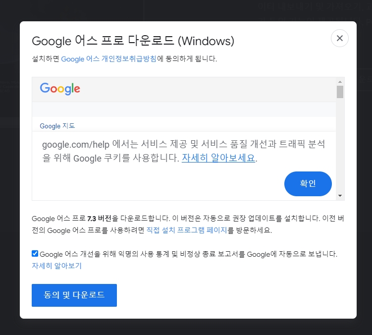 4. 추가로 스크롤하여 데스크톱용 어스 프로 버전 다운로드 버튼과 약관 동의 옵션이 나타나 전문 지도 제작용 기능을 제공하는 화면입니다.