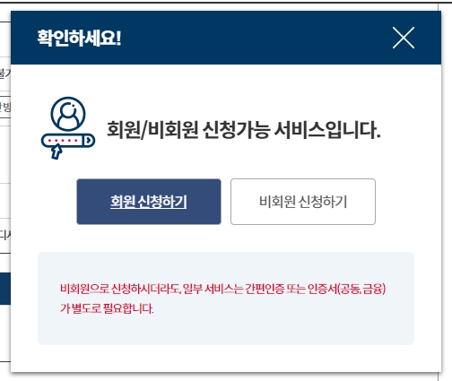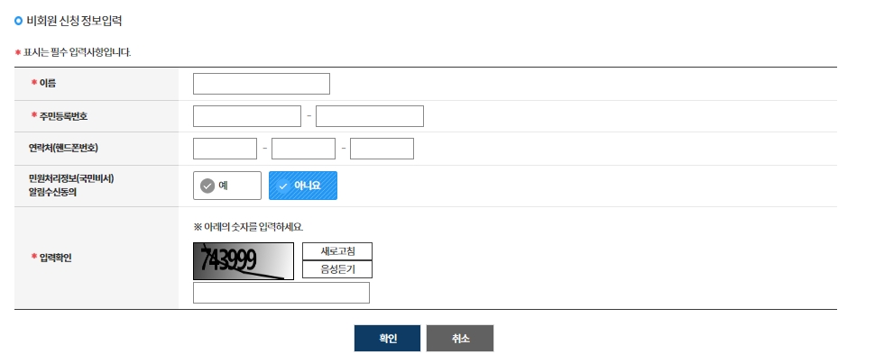 비회원으로 신청할 경우, 약관에 동의하고 개인정보를 입력한 다음 다음 단계로 넘어갑니다. 이 과정은 로그인 없이도 신청이 가능하다는 것을 의미합니다.