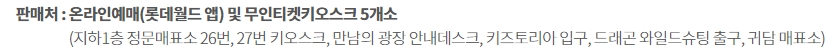 온라인이나 어플 사용이 익숙하지 않아서 직접 롯데월드 안에서 구매하고 싶으신 분들도 계실 텐데요. 이런 분들을 위해 파크 곳곳에 무인티켓키오스크가 설치되어 있습니다. 이 기계는 지하 1층 정문 매표소 26번, 27번 창구 바로 옆에 있고, 많은 분들이 약속 장소로 잡는 만남의 광장 안내데스크 근처에서도 찾을 수 있습니다. 또한, 키즈토리아 입구나 드래곤 와일드슈팅 출구, 귀담 매표소 쪽에도 있으니 동선에 맞춰 가장 가까운 곳을 이용하시면 정말 편리해요.