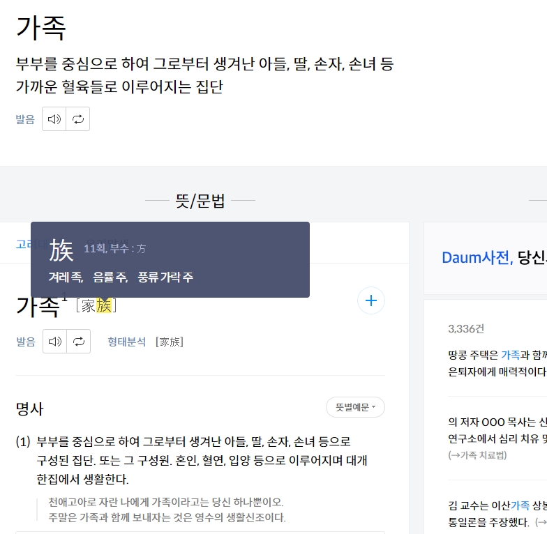 총 336건이나 되는 관련 단어가 검색된 것을 볼 수 있는데, 이걸 보면서 '가족'이라는 한자가 이렇게나 다양하게 쓰이는구나 하고 배울 수 있습니다. 단어 공부를 할 때도 아주 유용하겠죠?