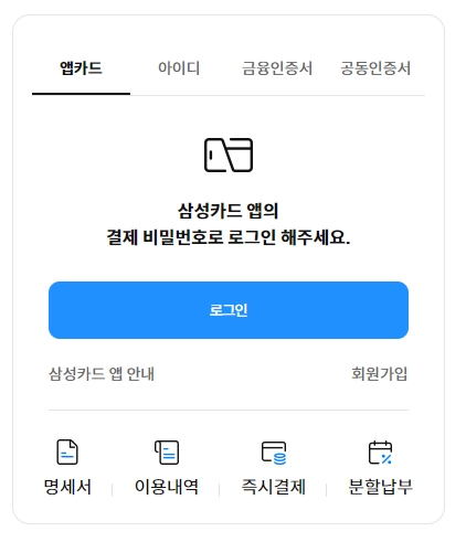 만약에 삼성카드 앱을 쓰고 계시면, 결제할 때 쓰는 비밀번호만으로도 아주 쉽게 들어갈 수 있어요. 앱카드 방식 말고도 그냥 아이디로 들어가거나, 금융인증서 또는 공동인증서 같은 걸로도 접속이 가능해서 편한 방법을 고르면 돼요.