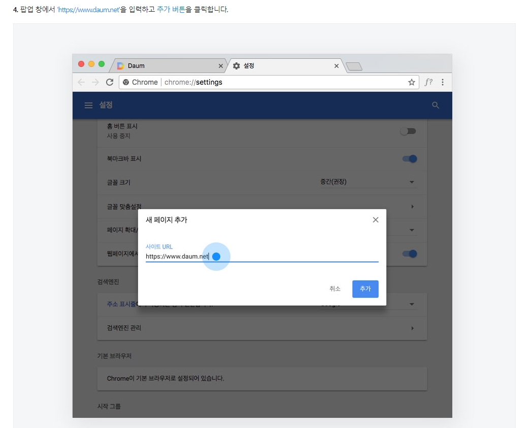 해당 항목을 선택하고 나면 그 바로 아래쪽에 '새 페이지 추가'라는 파란색 글씨의 버튼이 활성화되는 것이 보일 겁니다. 이 버튼을 클릭해주세요. 그러면 우리가 시작페이지로 지정하고 싶은 다음의 인터넷 주소를 직접 입력할 수 있는 작은 창이 하나 새로 나타나게 됩니다.