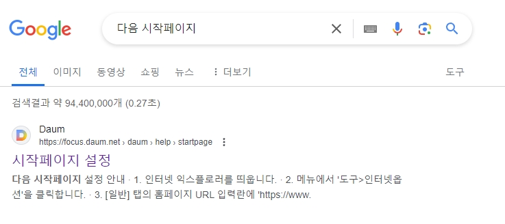 가장 먼저 다음을 시작페이지로 설정하는 제일 정확한 방법을 찾아야 하는데요. 인터넷 검색창을 열고 '다음 시작페이지 설정'이라고 검색을 해보세요. 그러면 여러가지 검색 결과가 나타날 텐데, 그 중에서 다음(Daum)에서 직접 운영하고 알려주는 공식 설명 페이지로 들어가는 것이 가장 좋습니다.