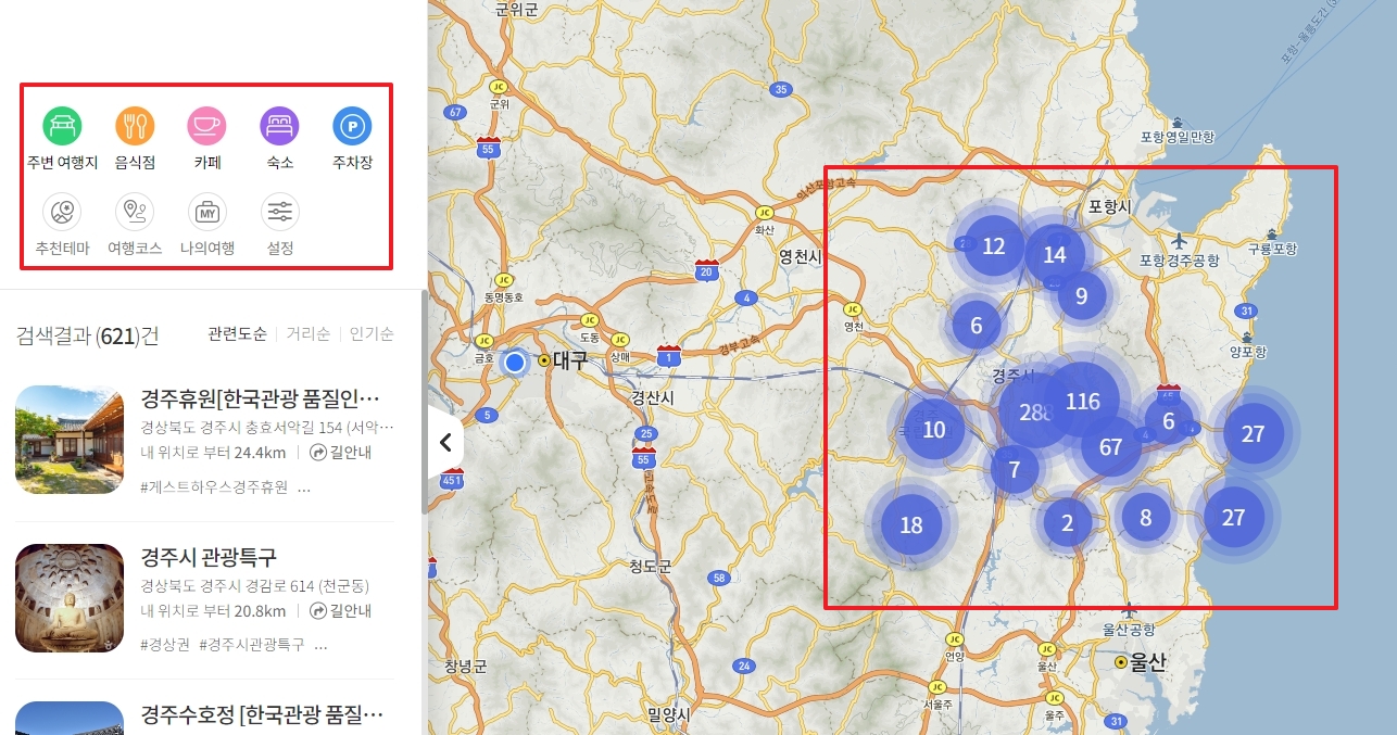 사이트에 접속한 후, 우측 상단에 있는 '여행 지도'를 클릭하면 우리나라 전체 지도를 보실 수 있는데요. 이 지도에서 검색창에 '경주'를 입력하면 경주의 주요 여행지가 지도 위에 표시됩니다. 카테고리별(여행지, 음식점, 카페, 숙소 등)로 필터링하여 원하는 정보만 골라 볼 수 있는 점이 큰 장점입니다. 지도를 확대하면 더 세밀한 지역 정보까지 확인 가능하니, 가고 싶은 장소를 미리 정해두고 동선을 짜는 데 활용하면 좋습니다.