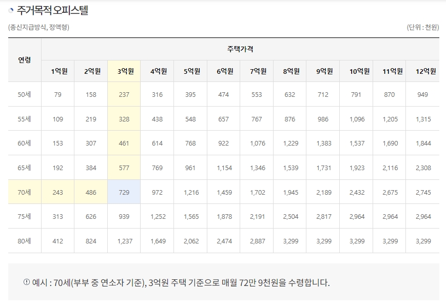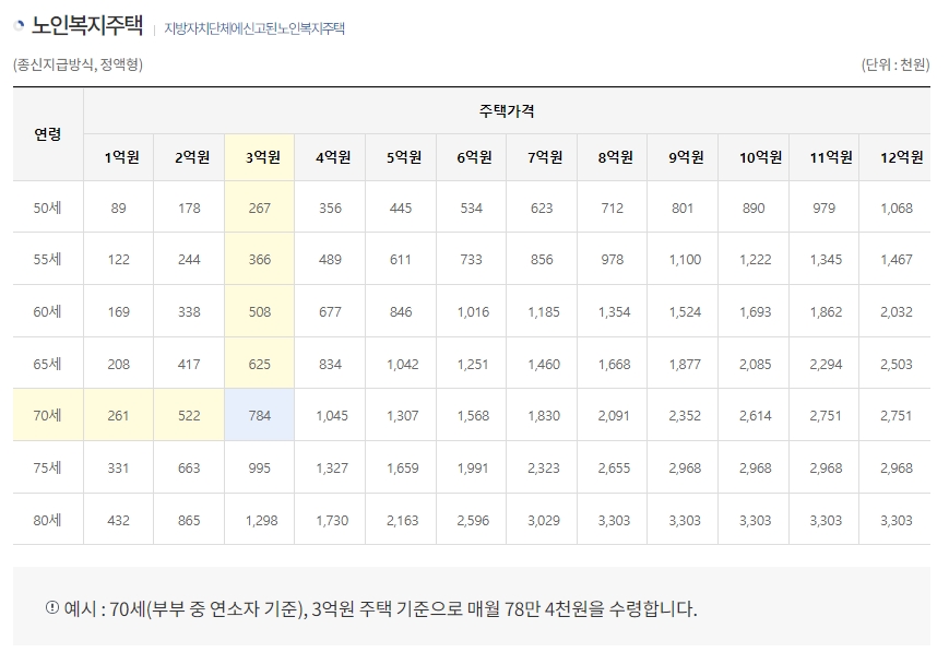 월지급금 예시 표는 종신지급방식의 정액형을 기준으로 작성되어 있습니다. 가입자의 연령이 높을수록, 그리고 담보로 제공하는 주택의 가격이 높을수록 매월 받는 연금액이 증가하는 것을 한눈에 확인할 수 있습니다. 예를 들어, 3억 원짜리 주택 소유자가 60세에 가입하면 매월 62만 원을 받지만, 70세에 가입하면 92만 원으로 수령액이 늘어납니다.